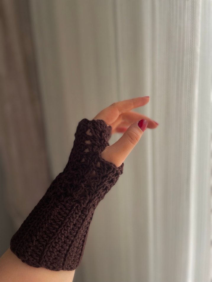 Yumuşak örgü kumaştan yapılmış, kahverengi parmaksız kadın eldiveni. Sıcak ve bohem tarzıyla retro veya hippie görünümüne uygundur.