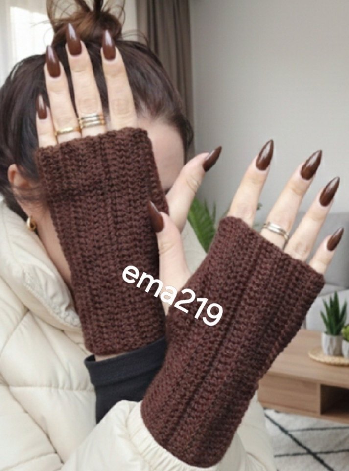 GÖRSEL BANA AİTTİR ✔️ İLAN AÇIYORUM ✔️ Koyu kahverengi örgü parmaksız eldivenler, rahat ve bohem tarzıyla gotik dokunuş sunar. Retro görünüm için ideal.