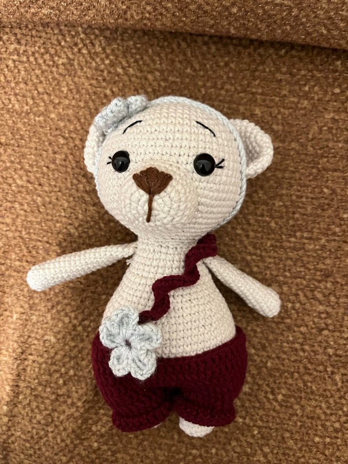 Yumuşak ipten örülmüş krem rengi peluş ayıcık, renkli çiçek detaylarına sahip. Sevimli gözleriyle dikkat çekiyor.
