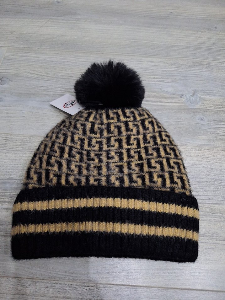 Koyu kahverengi desenli, örgü kumaştan yapılmış kadın bere, üstünde yumuşak bir ponpon bulunur. Rahat ve trend sokak tarzına uygundur.