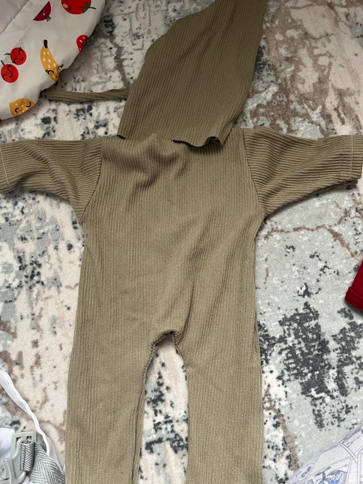 Yumuşak örgü kumaştan yapılmış, kapüşonlu kahverengi bebek tulumu. Soğuk günler için uygun streetwear tarzı.