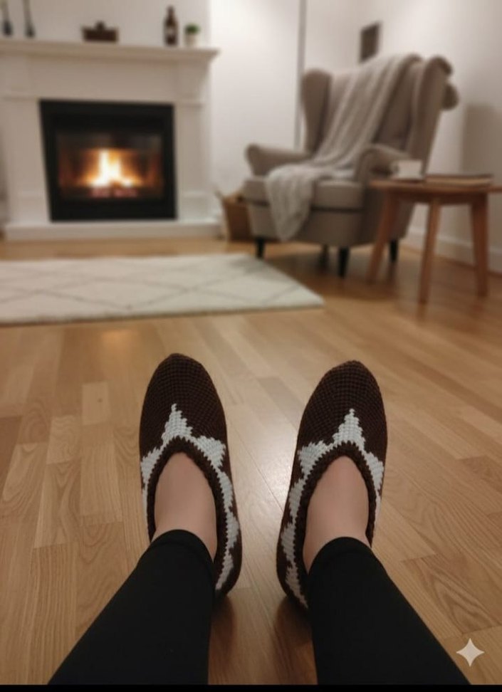 Koyu kahverengi örgü detaylı, stiletto topuklu kadın patiği rahat ve şık bir görünüm sunar. Günlük kullanıma uygundur.