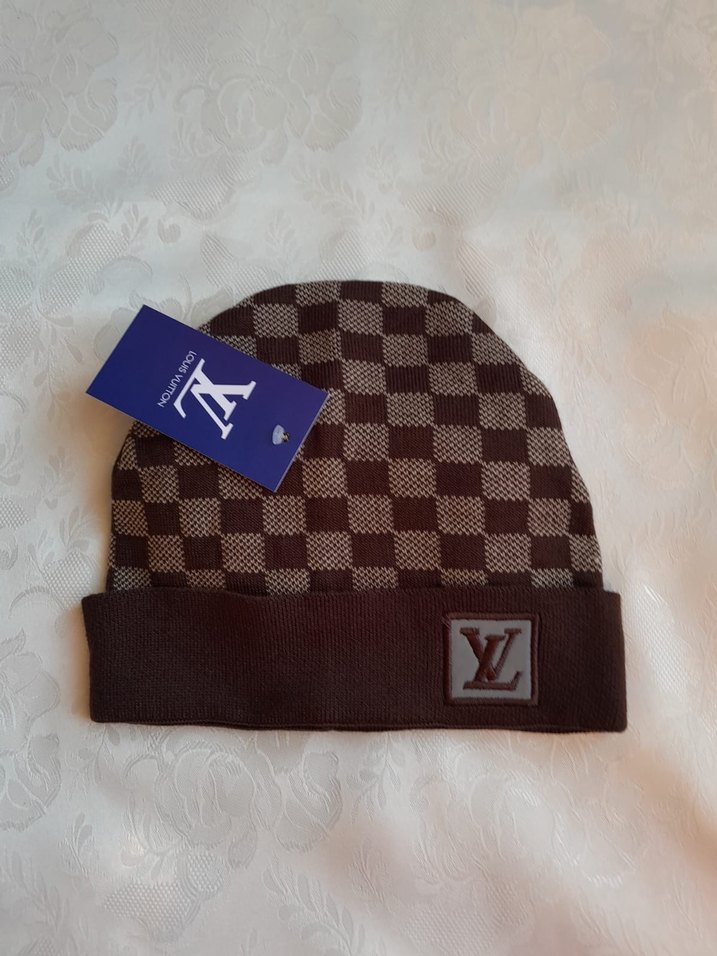 Koyu kahverengi örgü triko bere, yumuşak ve sıcak kumaş, kare desenli ve şık logo detaylı, trend sokak stili için uygun.