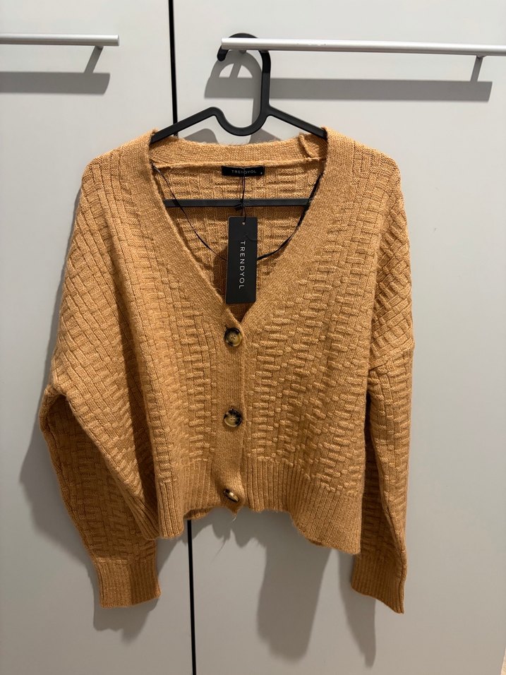 Kahverengi örgü kumaştan, V yakalı ve uzun kollu, bol kesim midi uzunlukta kadın hırka. Sade ve desensiz tasarımıyla günlük rahatlığa uygun.