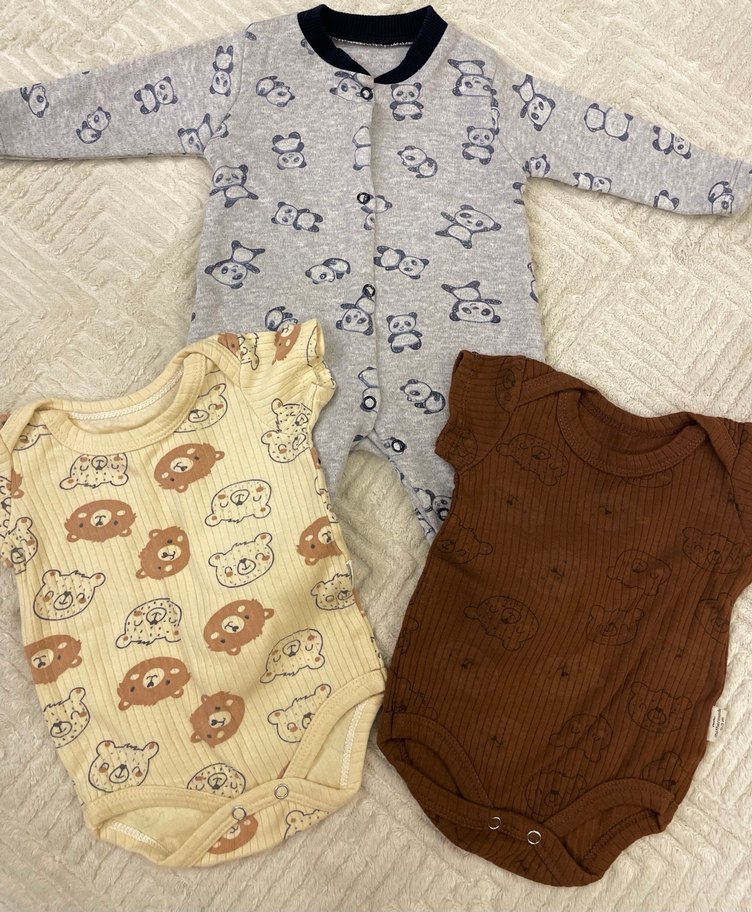 Uzun kollu, bisiklet yakalı kahverengi örme bebek body, ince baskılı desene sahiptir. Kolay giydirme için çıtçıtlıdır.