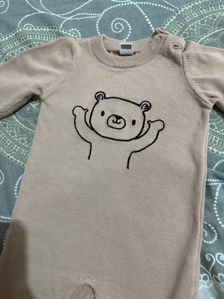 Kahverengi örme kumaştan, uzun kollu, yuvarlak yaka ve ayıcık baskılı bebek tulumu. Rahat ve yumuşak dokulu kumaş içerir. Hiç giyilmedi
