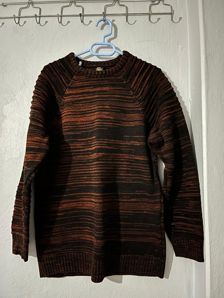 Bu kahverengi örme erkek kazak, yuvarlak yaka ve uzun kolludur. Rahat kesimi ve normal boyuyla günlük kullanıma uygundur.