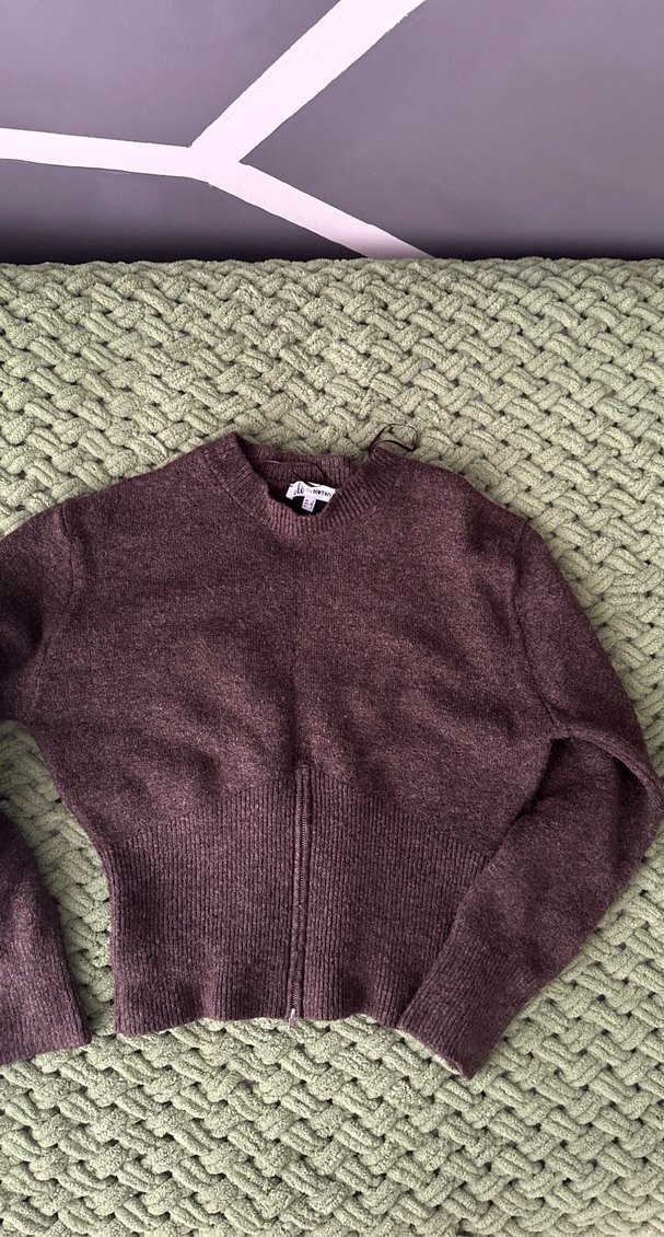 Fıtılı, uzun kollu, yuvarlak yakalı kahverengi kadın kazak, yumuşak örme kumaştan, günlük kullanıma uygun. Birkaç kere giyildi