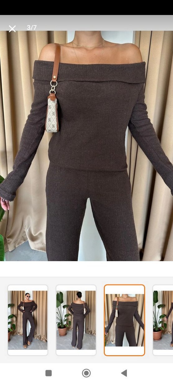 Kahverengi, yumuşak örme kumaştan, yüksek yakalı ve uzun kollu, kemerli, midi boy, sade kadın takımı. Rahat sokak stili için uygundur. göründüğü gibi alt boyu 110 cm üst boyu tam boy rahat kalıp