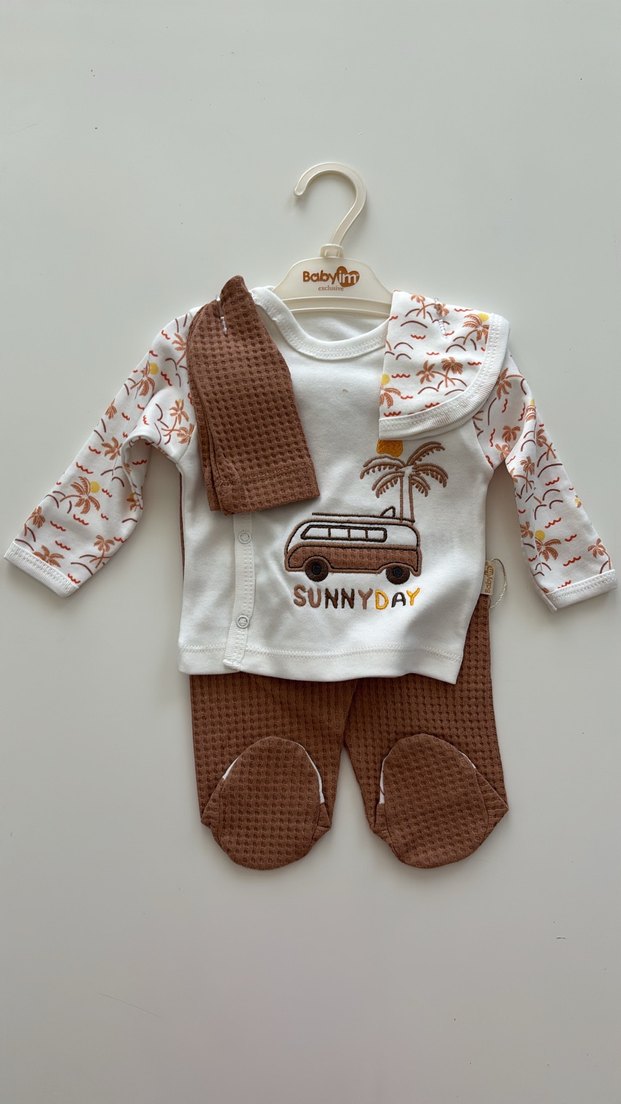 Uzun kollu, kahverengi örme pamuk bebek takımı. Baskılı detaylı, bisiklet yaka, şapka ve ayaklı pantolon dahil.