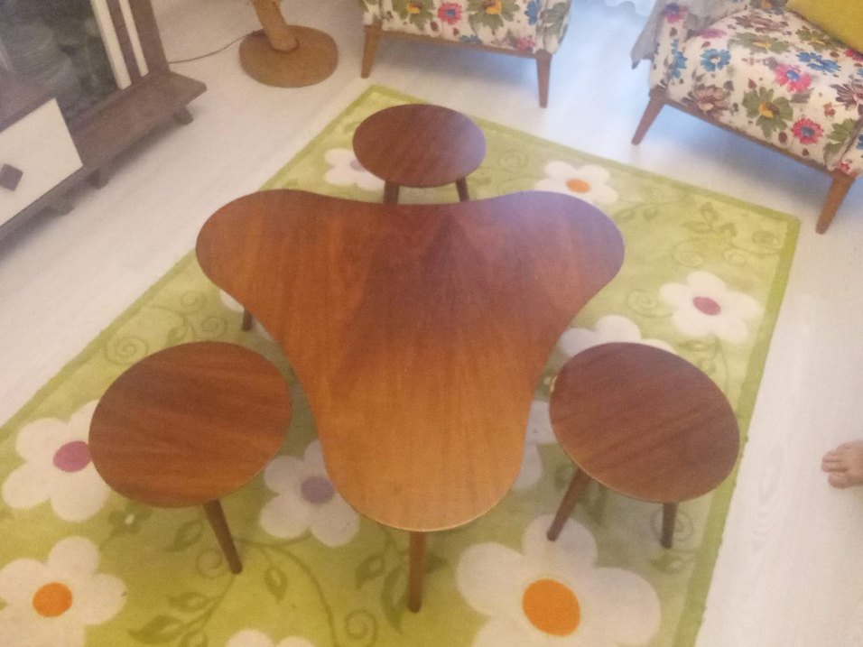 Kahverengi, üç yuvarlak tabure ve benzersiz şekilli oyun masası içeren çocuk mobilya seti. Çiçek desenli halının üzerinde yer alır.