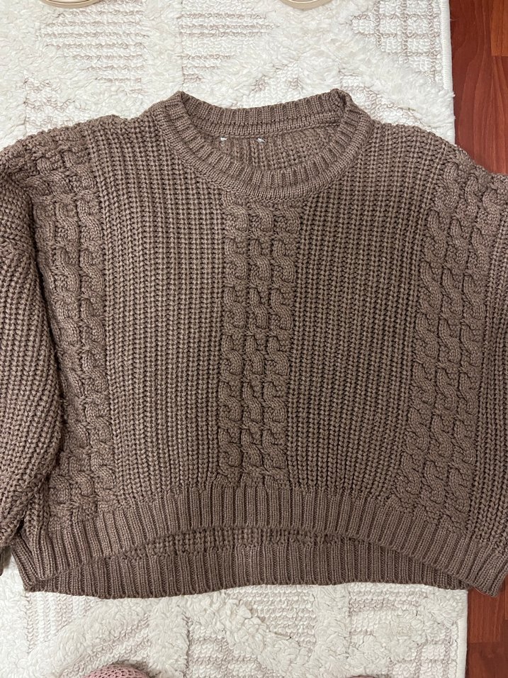 Bu kahverengi örgü kadın kazak, yuvarlak yaka ve uzun kollu, bol kesim, normal boyda, gündelik kullanıma uygun bohem tarzda bir parçadır.