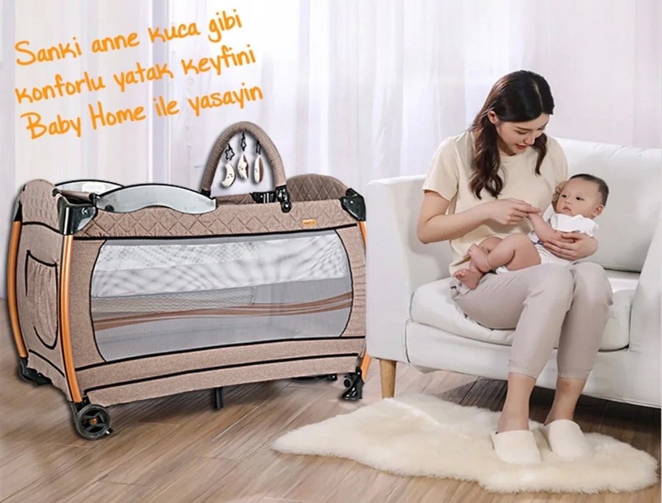 Hafif kahverengi oyun parkı yatak, file yanları ve yumuşak dolgusu ile bebekler için güvenli ve rahat bir alan sunar. ️Sayılı kullanıldı sadece fermuarı bozuktur her şeyi tamamdır