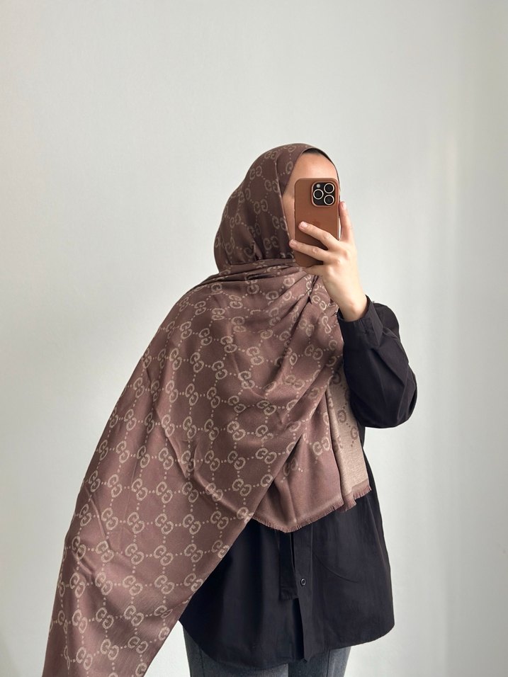 Koyu kahverengi, ipeksi dokulu ve drapeli tasarıma sahip kadın şalı, sade ve rahat sokak stiline uygundur.