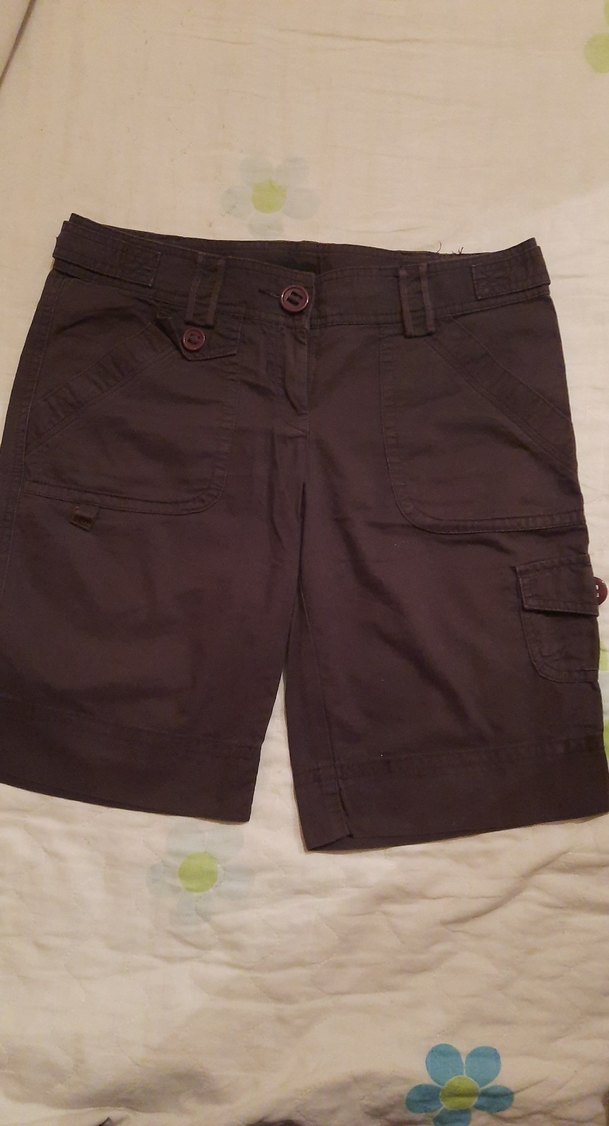 Kahverengi pamuklu, kemerli, bol kesim kadın bermuda şort, rahat ve gündelik dış mekan kullanımı için uygundur.
