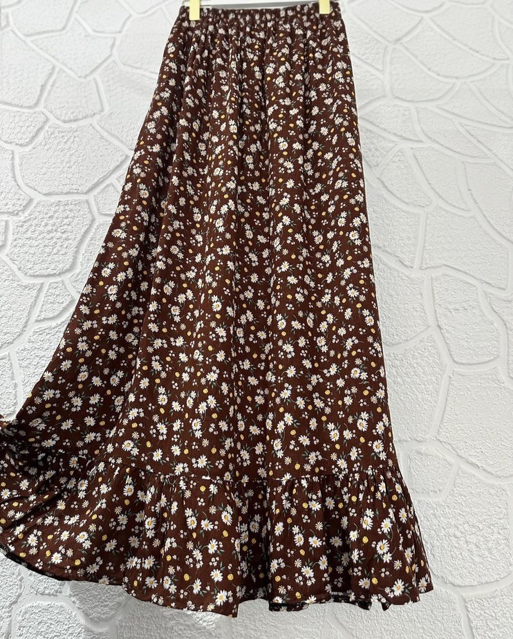 Kahverengi Papatya Desenli Fırfırlı Uzun Etek