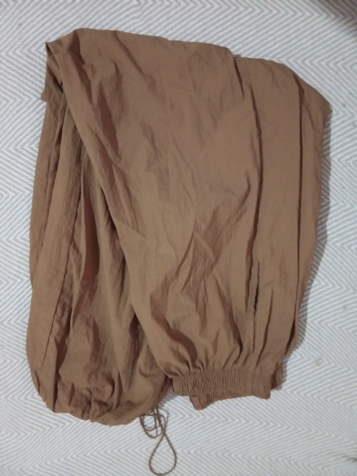 Kahverengi paraşüt kumaştan, salaş kesim ve lastikli paçaya sahip midi boy pantolon. Elastik paça ucu ve sade tasarımıyla dış mekan kullanımı için uygundur.