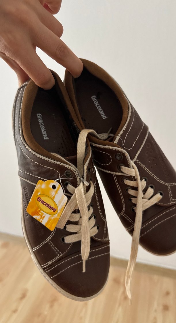 Kahverengi casual tarzda, parlak görünümlü spor ayakkabısı. Bej bağcıklı ve belirgin dikiş detaylarına sahip. Hiç kullanılmadı etiketi üzerindedir