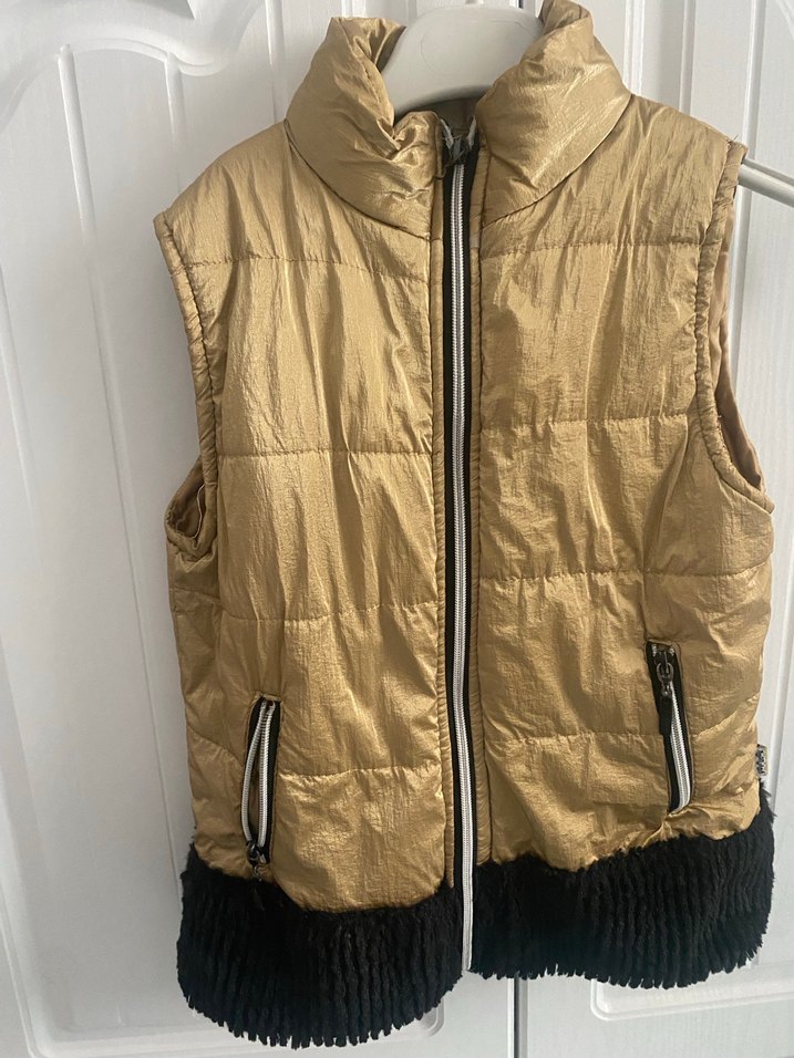 Kahverengi parlak sentetik kumaştan, fermuarlı, yüksek yakalı, kolu olmayan ve vücuda oturan normal midi uzunlukta yelek. Alt kısmı siyah dokulu, günlük kullanıma uygun.