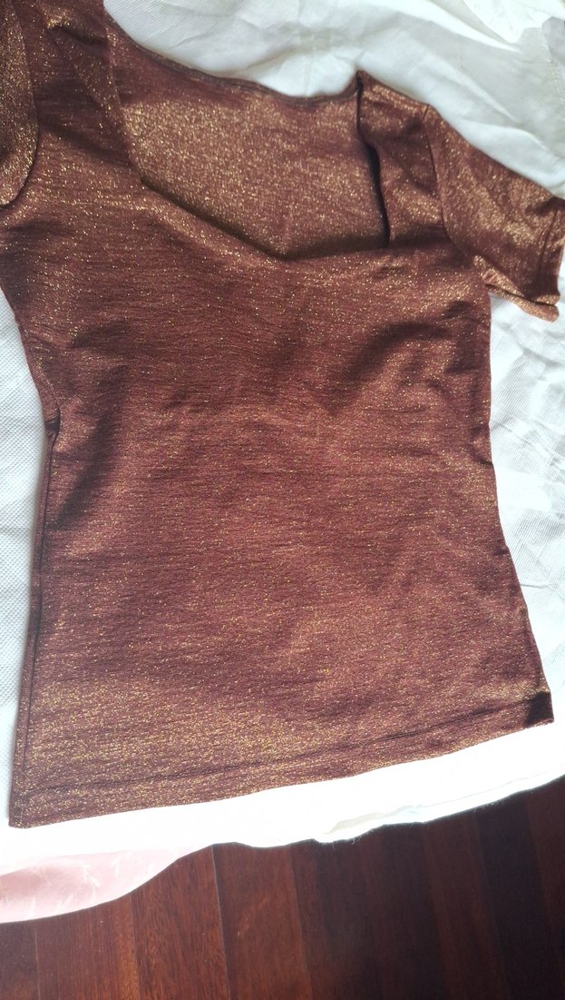 Kahverengi, parlak,Sarı simli kumaştan yapılmış, kısa kollu, vücuda oturan bluz.Gece ve Gündüz için uygundur.İki kol altı 40 cm.Boyu 55 cm.Esner.Marka muadili.S-M-L ✨