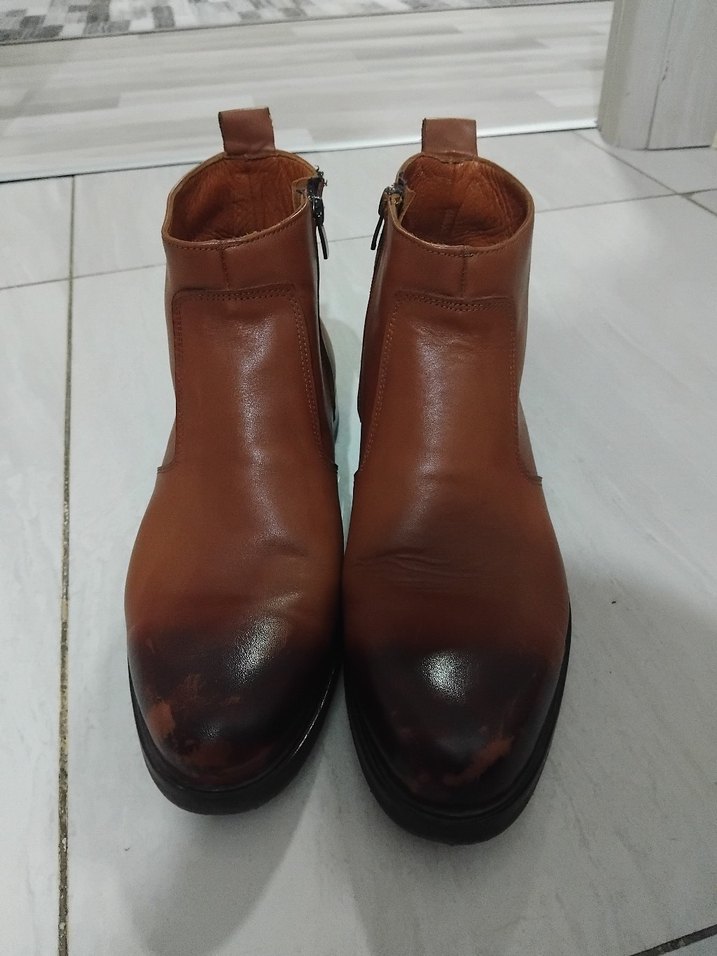 Kahverengi parlak deri erkek bot, tokalı detaylı, günlük kullanıma uygun çağdaş ve klasik tasarımda, desensiz ve şık stil. İtalya'dan alındı hakiki İtalyan derisi bir iki kez giyildi tertemiz yeni