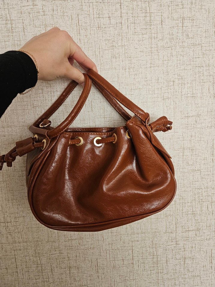 Bu kahverengi deri kadın çanta parlak görünüme ve tokalı detaylara sahiptir. Minimalist tasarımıyla günlük ve şık sokak stiline uygundur.