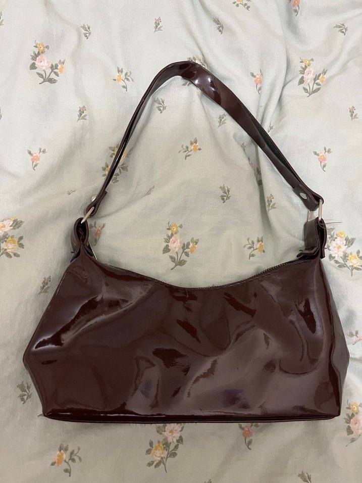 Koyu kahverengi deri çanta, parlak yüzeyli ve desensiz tasarıma sahip. Günlük kullanım için uygun, modaya uygun gotik tarzda.