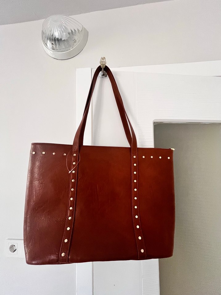 Kahverengi parlak deri kadın çanta, tokalı detaylara sahip, minimalist ve çağdaş tarzda günlük kullanım için uygun. Yurt dışı ürünü