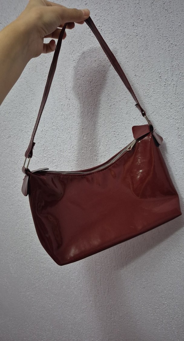 Kahverengi parlak deri kadın omuz çantası, fermuarlı kapama ve minimalist sokak stiliyle trendy günlük kullanıma uygun.