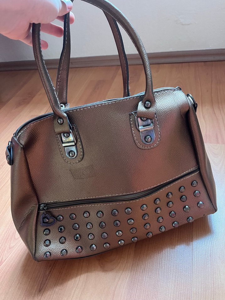 Parlak kahverengi deri omuz çantası, tokalı kulplar ve ön cepte metal perçin detayları ile trend rock punk tarzını yansıtıyor. Günlük kullanım için uygun.