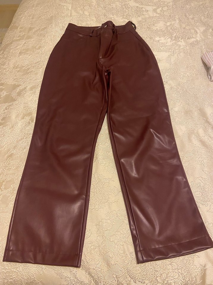 Kahverengi parlak deri, kürk detaylı, normal uzunlukta ve regular fit kadın pantolon. Sokak modası ve günlük kullanım için uygun, rahat ve şık tarzda.