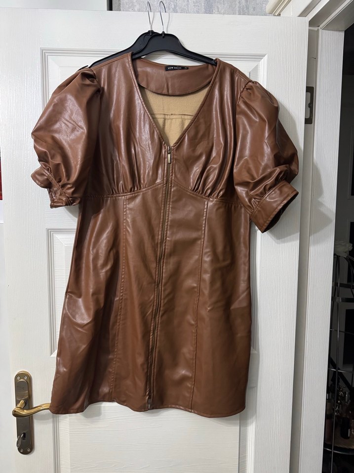 Kahverengi parlak deri, kısa kollu, V yakalı ve kemerli bel detaylı, midi boyda, sokak modasına uygun dar kesim elbise.