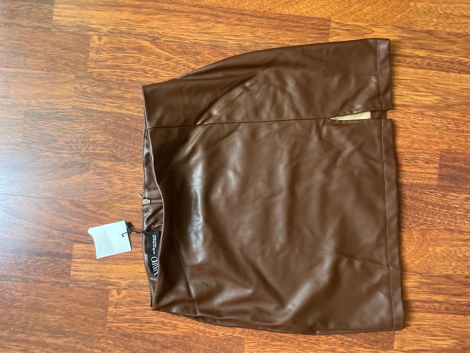 Kahverengi parlak deri, fermuarlı, midi boy, dar kesim etek ofis için uygun, minimalist sokak tarzında.