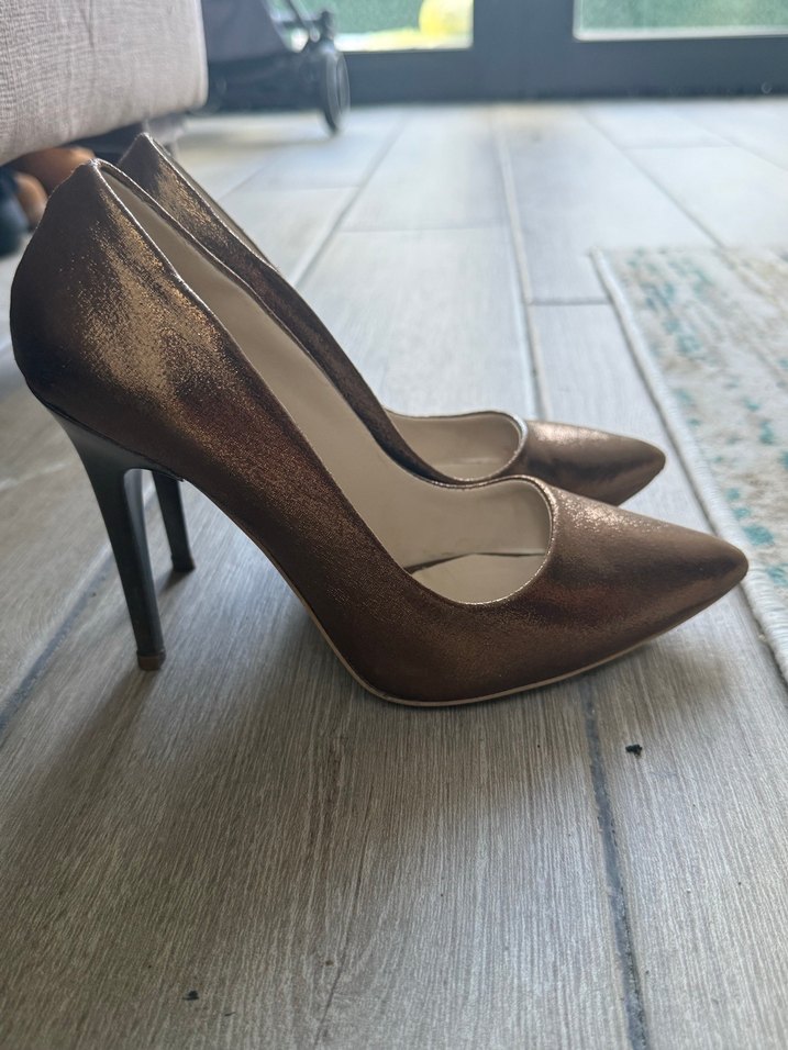 Kahverengi parlak deri stiletto topuklu kadın ayakkabı, tokalı detaylı, ofis için şık ve zamansız bir model. ✨bronz iki gün giyildi