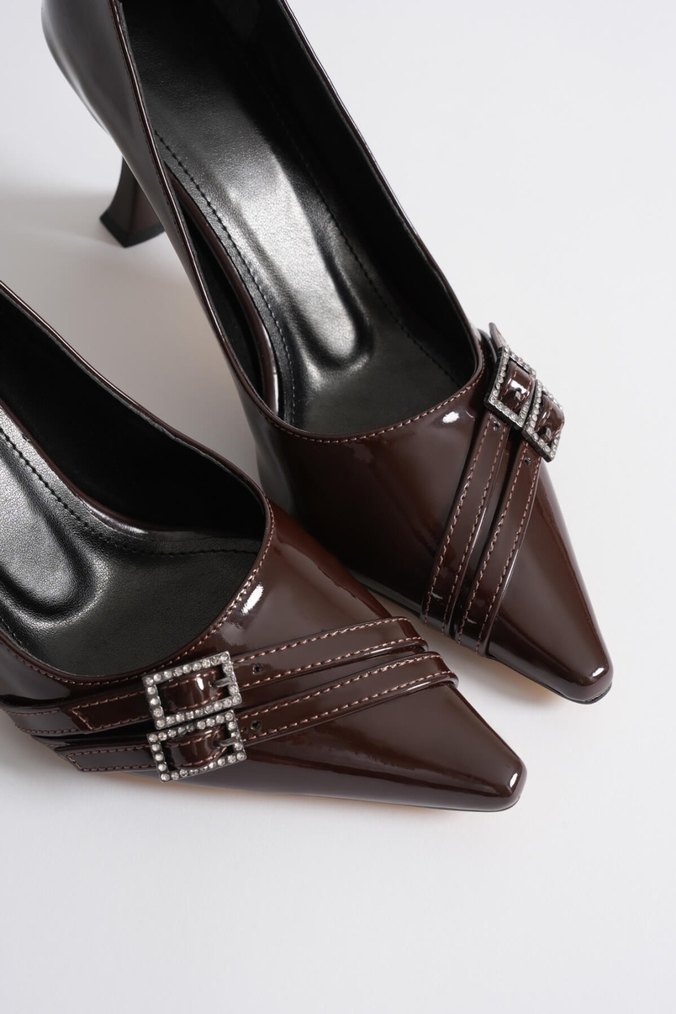 Kahverengi Parlak Deri Stiletto Tokalı Kadın Ayakkabı
