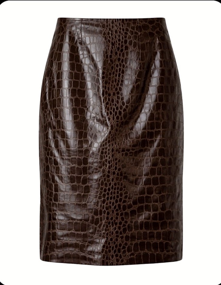 Adil ışık Kahverengi parlak suni deri yılan desenli midi etek, kemerli, tek tarafı yırtmaçlı ve düzenli kesimlidir ⭐ 38 bedene uyumlu ⭐Ofis için klasik ve çağdaş bir stil sunar ⭐ en küçük bir sorunu yoktur ⭐ #crocodil #timsahderisi #derietek