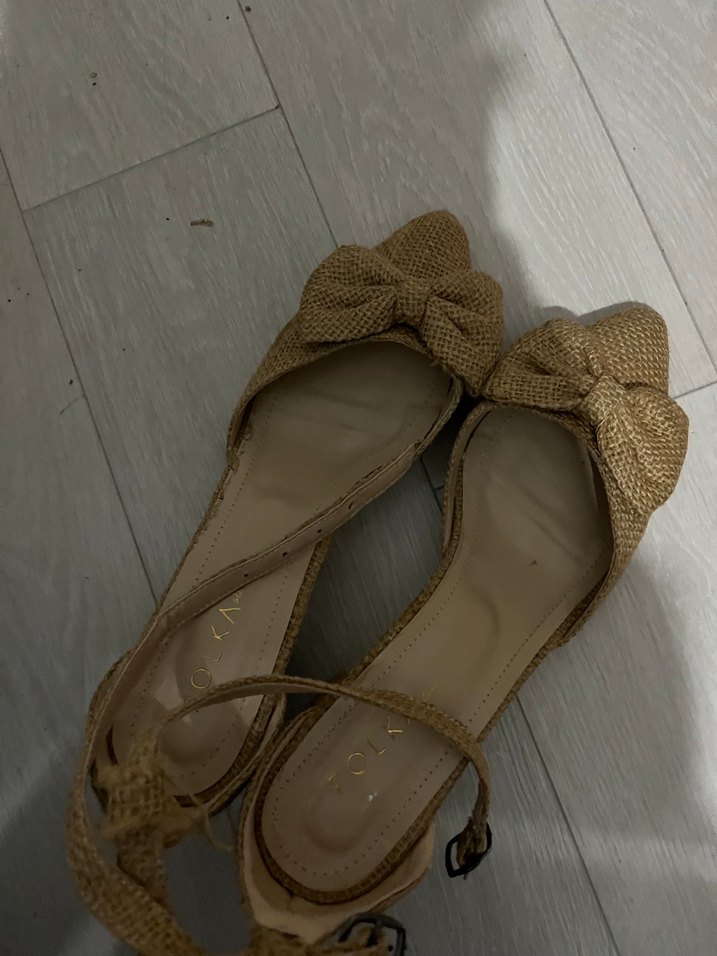 Kahverengi parlak dolgu topuklu, tokalı kayışlı, bohem tarzda, kauçuk malzemeden yapılmış günlük rahat kadın sandaletleri.