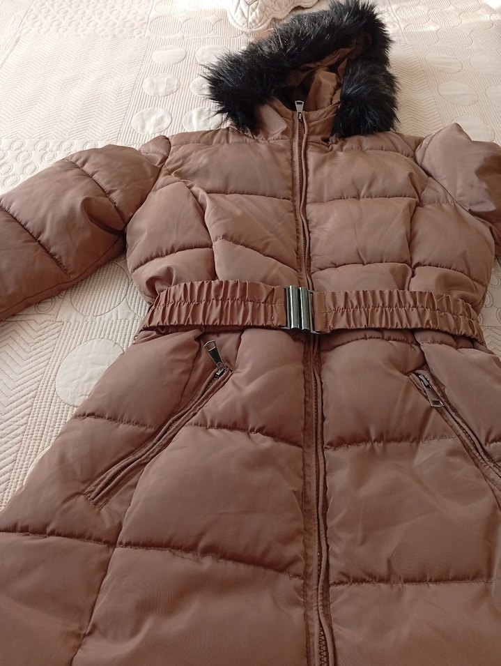Kahverengi parlak, fermuarlı ve çıtçıtlı kadın kışlık mont. Yumuşak sentetik kumaştan, normal midi boyda, rahat biker tarzında tasarlanmıştır.