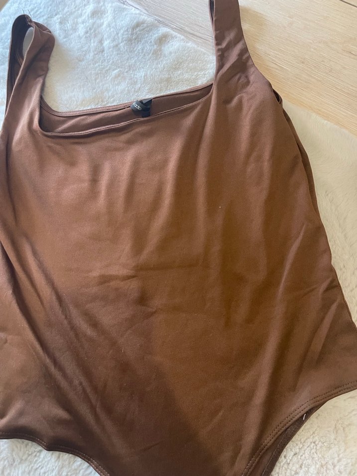 Kahverengi, parlak görünümlü, tek parça ve koltuksuz, tekne yaka, normal midi boyda, vücuda oturan hemşirelik bodysuit.