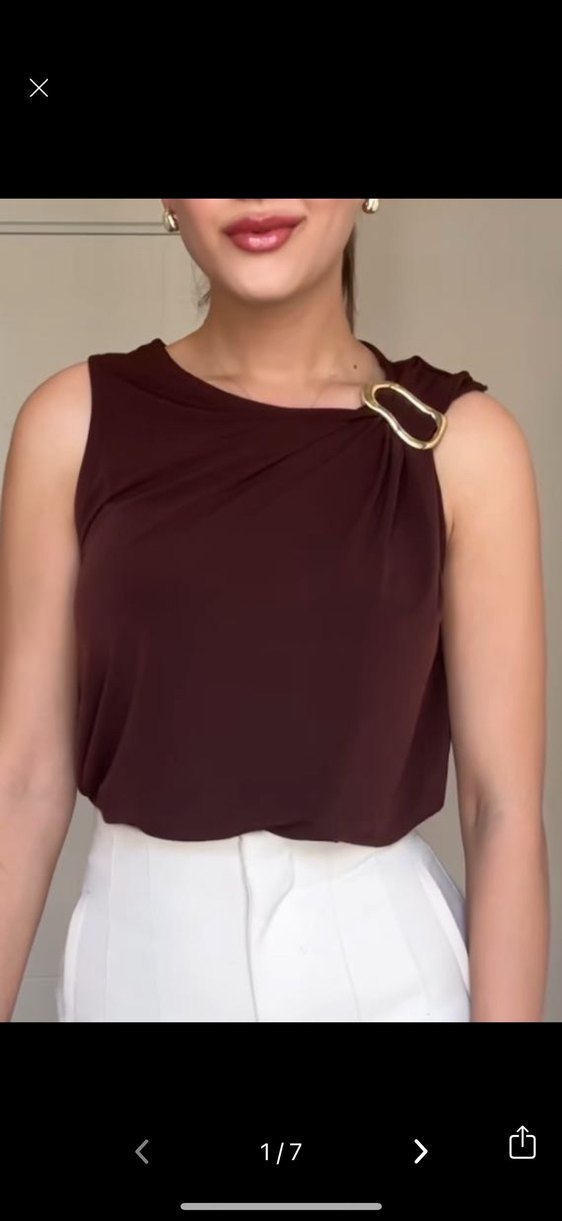 Kahverengi, parlak ve saten dokulu kolsuz bluz. Yüksek yakalı, bol kesim ve omuzda kemer detaylı, ofis kullanımı için uygun. Az kullanıldı 34 beden