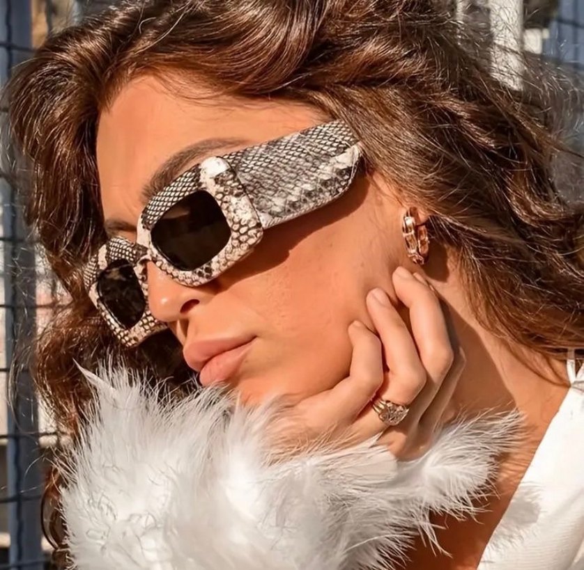 Kahverengi parlak, kürk detaylı kadın güneş gözlüğü, cesur sokak stiliyle moda öncülerine uygun. ️