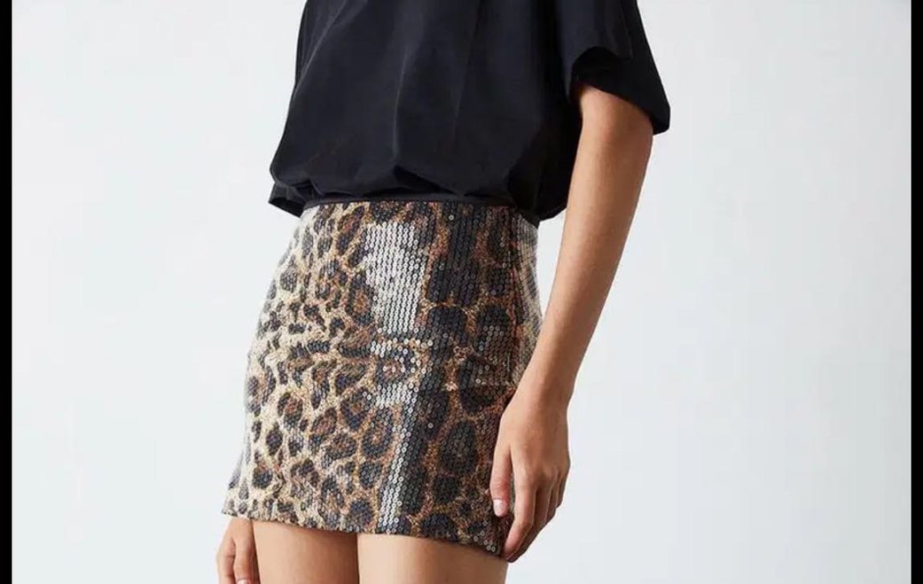 Sentetik kumaştan yapılmış, yılan desenli, payetli ve parlak kahverengi mini etek. Trendy günlük ve parti kombinlerine uygun.
