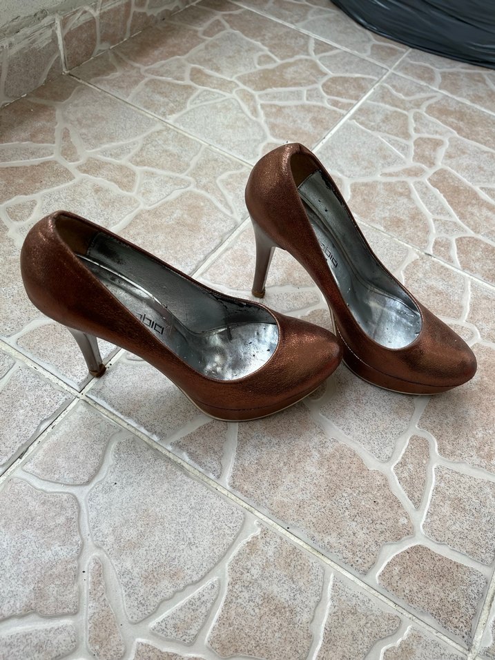 Kahverengi, parlak platform topuklu ayakkabı. İç kısmında kullanıma bağlı hafif deformeler (soyulmalar) bulunuyor, detaylarını fotoğraflarda görebilirsiniz.