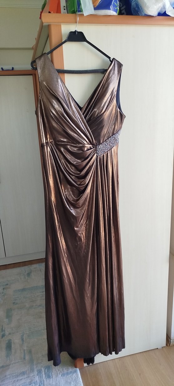 Parlak kahverengi kumaştan, drapeli ve V yaka, sıfır, klasik ve şık abiye elbise. ✨ Defosunu ekledim. Sadece bir kez giyildi. Yıkanmış ve temizdir. Üstümde nasıl durduğunun fotoğrafını da en sona ekledim. Fotoğraflardan tüm detaylara ulaşabilirsiniz.