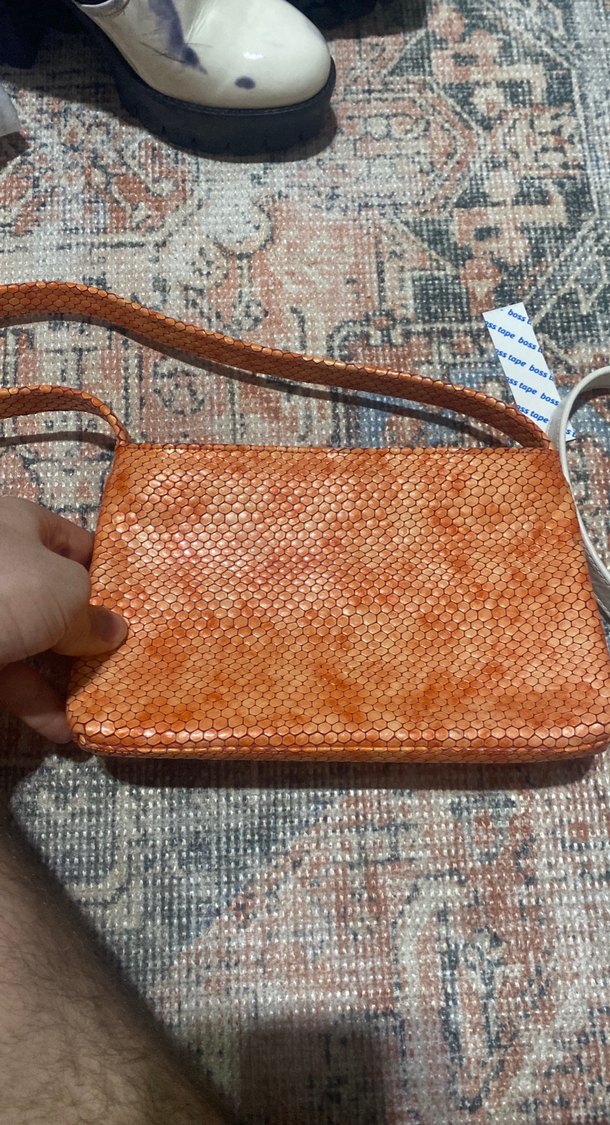 Kahverengi parlak deri kadın çanta, yılan desenli ve kemerli tasarımlı, bohem vintage tarzına uygun.