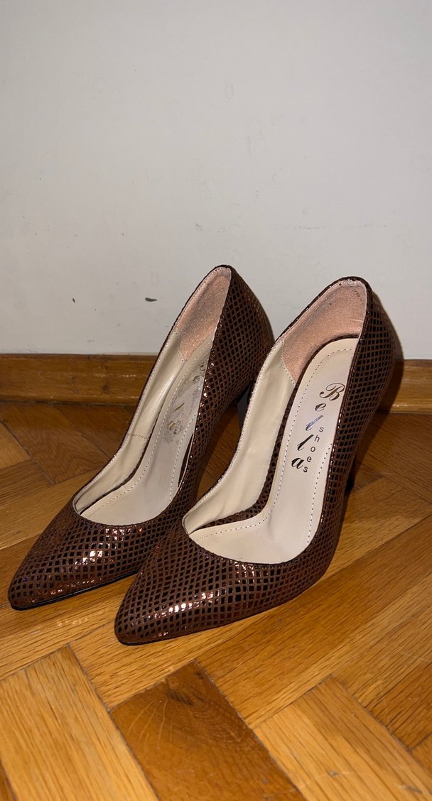 Kahverengi parlak yılan desenli deri stiletto, tokalı detayıyla romantik akşamlar için uygun, çağdaş ve klasik zarafet sunar.