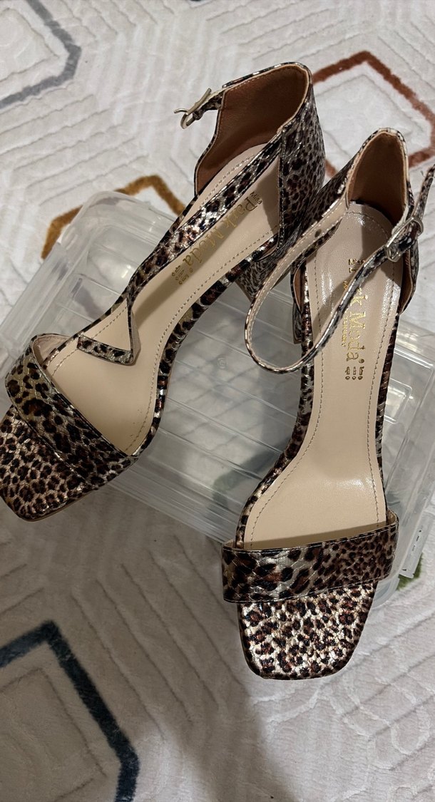 Kadınlar için blok topuklu, parlak kahverengi yılan desenli tokalı ayakkabılar. Modern tarzda, cesur ve romantik akşamlar için uygundur. Malzeme kauçuktur.