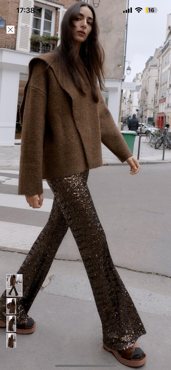 Bol kesim, midi boy kahverengi yün pantolon, parlak sim detaylıdır. Desensiz, günlük ve sokak stili için uygundur. ✨