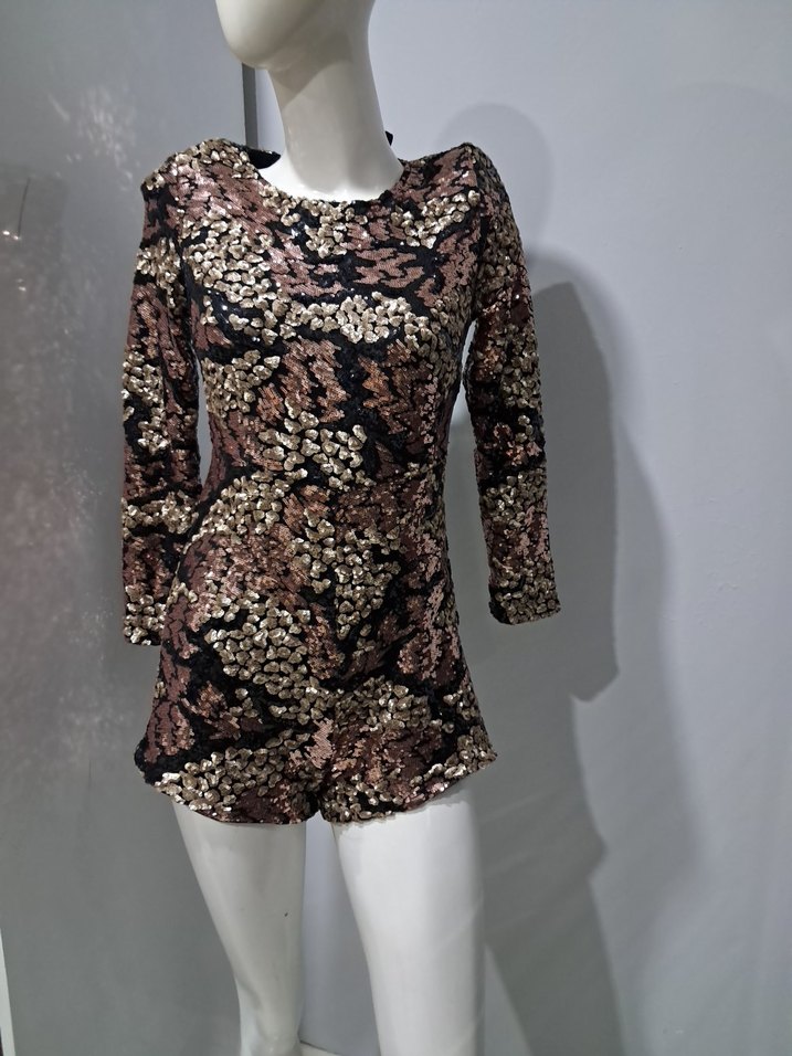 uzun kollu, dantel detaylı, kahverengi yılan desenli, mini ve vücuda oturan abiye şort modern parti tarzı için uygun.