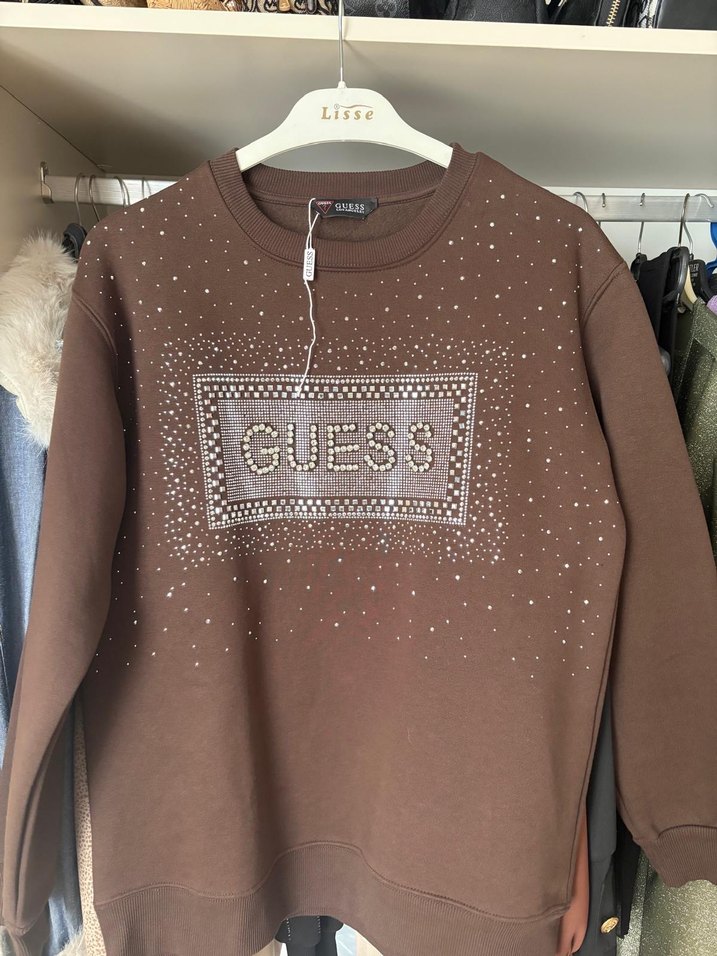 Kahverengi GUESS sweatshirt, bol kesim, uzun kollu ve bisiklet yaka. Önü parlak payetli baskılı, yumuşak ve sıcak kumaştan üretilmiştir. ✨
